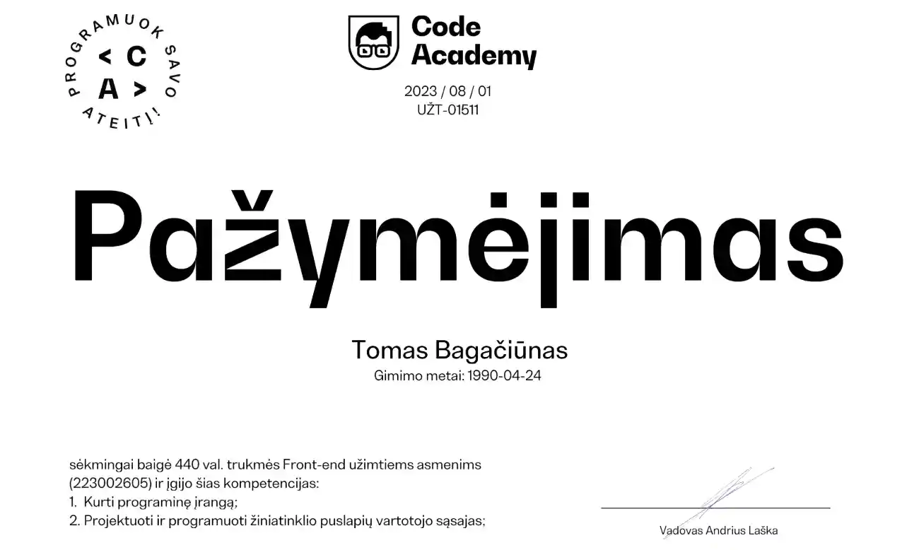 Esu Tomas – front-end programuotojas ir WordPress specialistas. Kuriu modernias, patogias bei konversijas didinančias svetaines ir e. parduotuves. Mano patirtis apima ne tik svetainių kūrimą, bet ir SEO optimizaciją, bei Google Ads ir Facebook Ads reklamų valdymą – tai padeda mano klientams sulaukti daugiau lankytojų ir paversti juos pirkėjais.